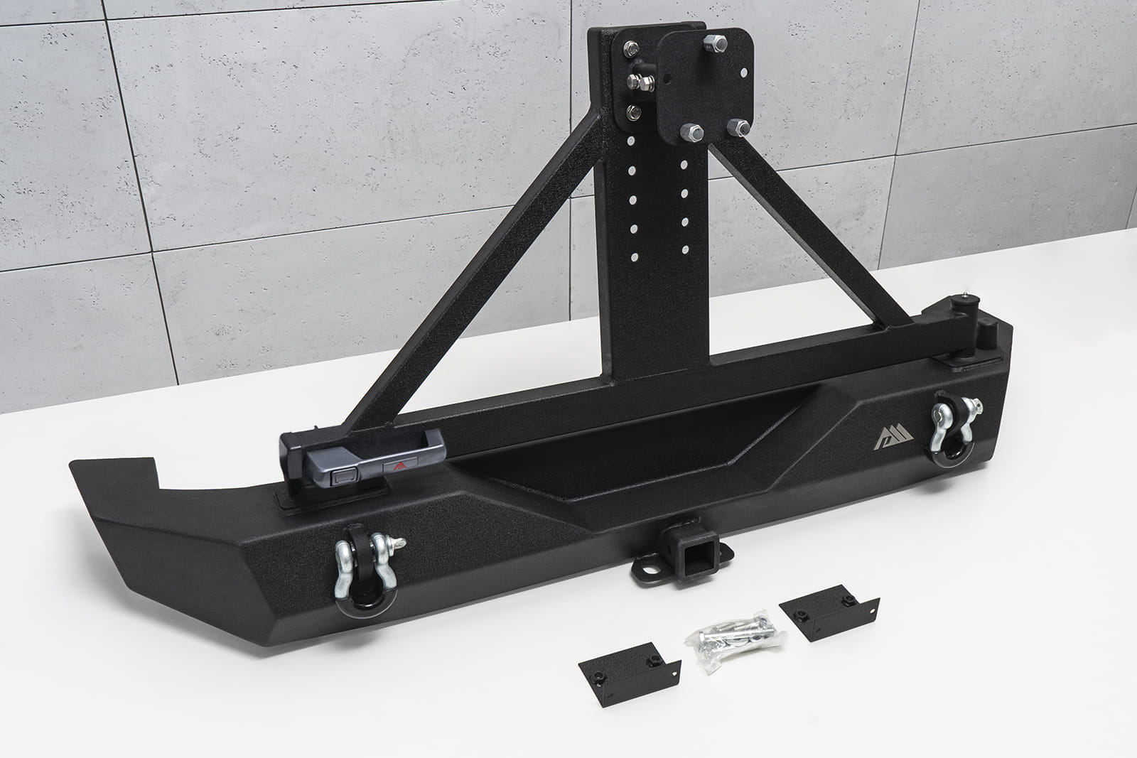 Hátsó lökhárító pótkerék rögzítéssel. A terméket a kaliforniai Paramont Automotive cég kifejezetten a 2007-2018-as JEEP WRANGLER JK számára tervezte.