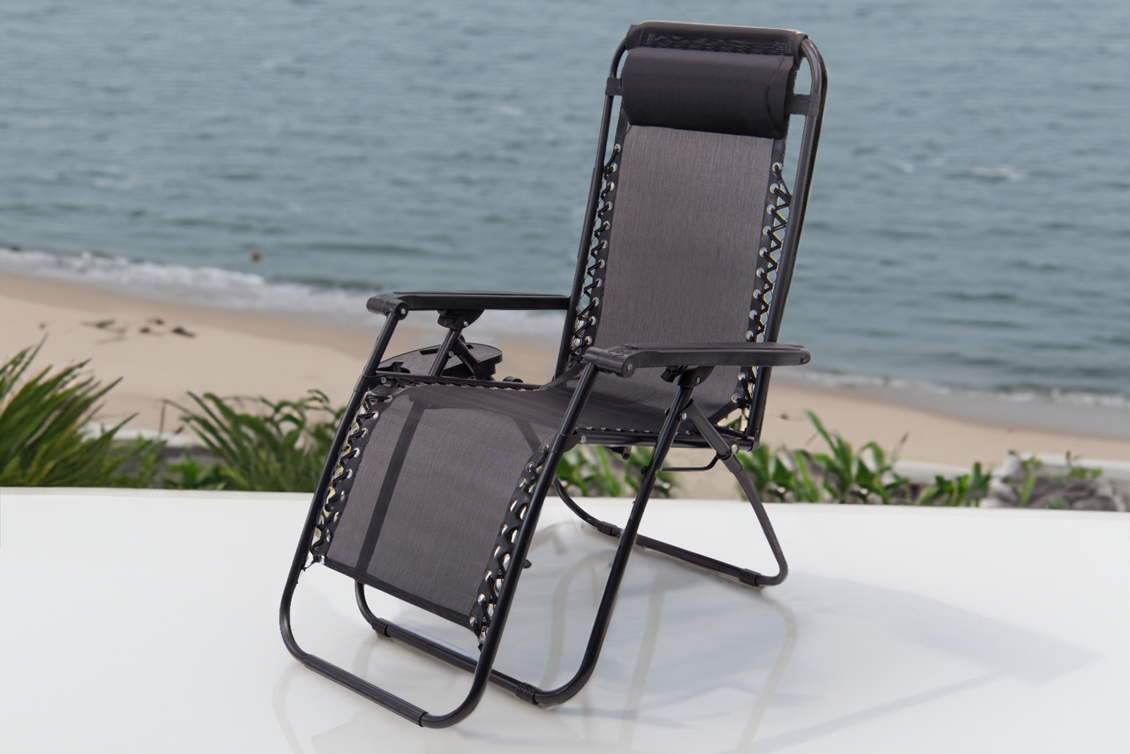 Összecsukható, kényelmes nyugágy lábtartóval, fejtámlával és italasztallal fekete színben.